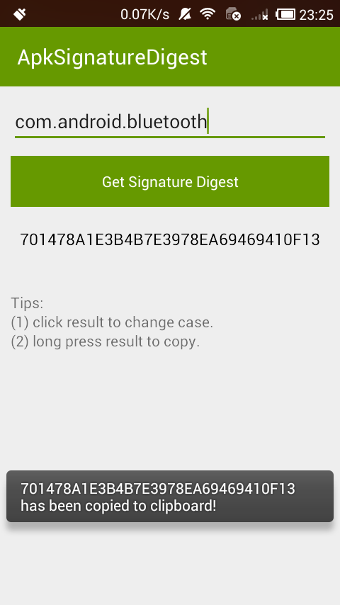 将APK发布到应用商店或接入第三方的SDK时,有时需要提供APK的签名摘要信息,可以通过摘要算法MD5或SHA-1来获取签名的摘要,除了获取自己的APK签名,也可以获取手机上其他已安装的APK签名,只需要传入其他APK的包名即可. 源码和APK下载地址:https://github.com/whinc/apk-signature-digest