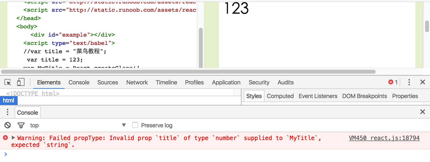 以下实例创建一个 Mytitle 组件,属性 title 是必须的且是字符串,如果是一个数字则会报错 :