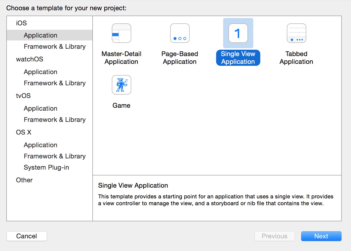 2、我们选择一个"Single View Application",并点击"next",创建一个简单示例app应用。