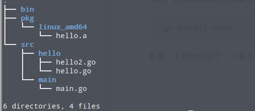 该命令的意思大概是:编译并安装hello包,这里安装的意思是将生成的*.a文件放到工作目录$GOPATH/pkg目录下去