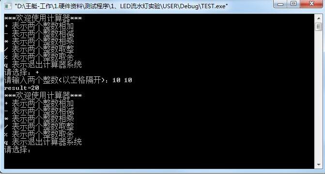 这样就完成了一个简单计算器程序,形式和我写的《用C语言完成简单的计算器功能(1)》一样,只是通过符号来选择对应的操作,原理一致。下面我们看一下改程序运行的结果,如下: