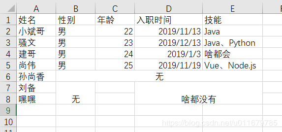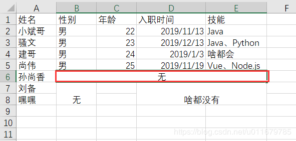 可以看到第六行的2-5列都是合并单元格,内容是无,第七行和第八行的第二列是合并单元格,内容是无,第七行和第八行的第四和第五列是合并单元格,内容是啥都没有。