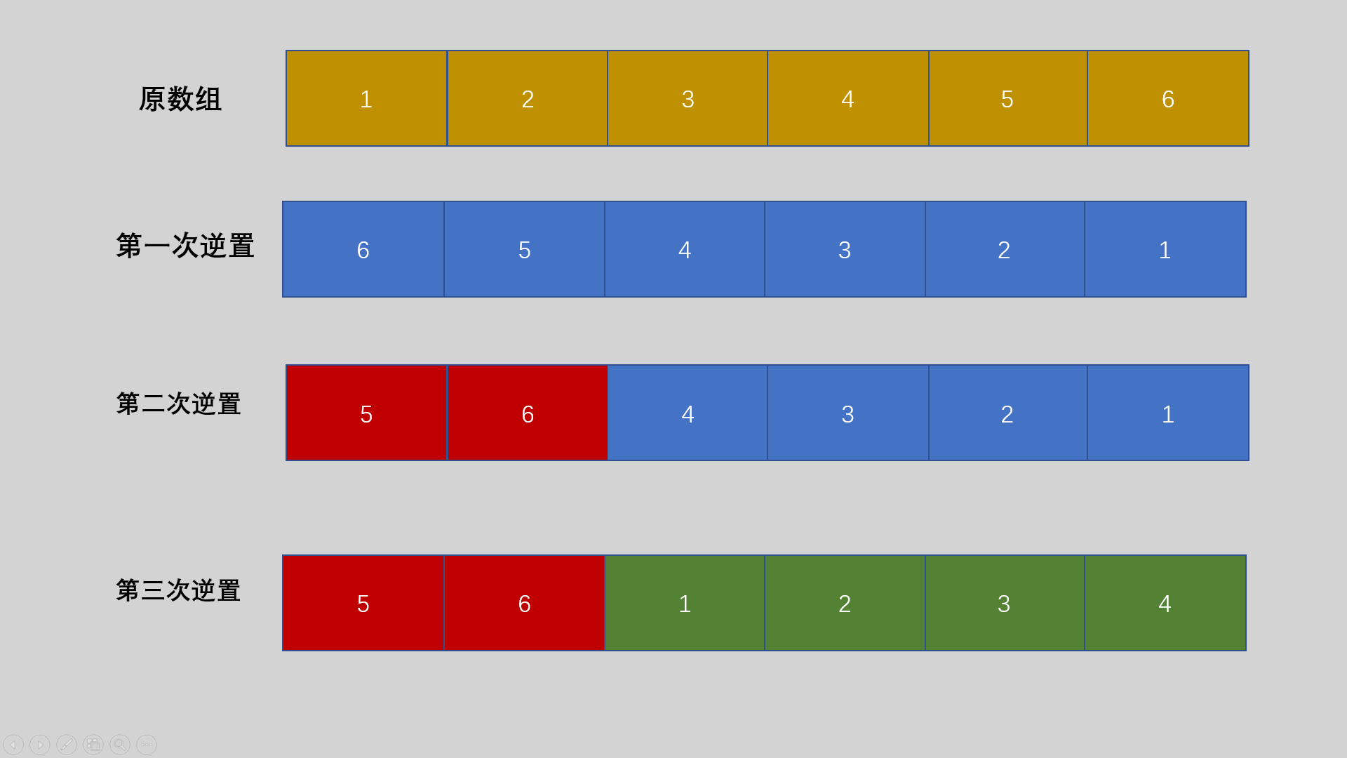 假设N=2,M=2,具体数组为nums[6]={1,2,3,4,5,6};则逆置过程如下图所示:
