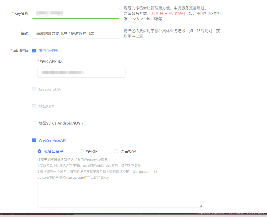 重点提示:小程序不需要在WebServiceAPI填写域名,否则会报错
