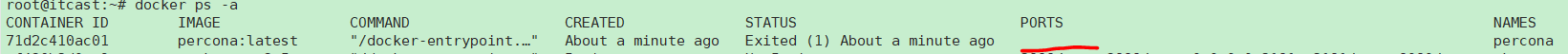 命令的参数不了解的可以看下官方文档或者随便搜个docker视频教程, 都有解释. 然后我开启此容器, docker start percona. 开启完后查询所有运行中的容器docker ps, 这时候出问题了: