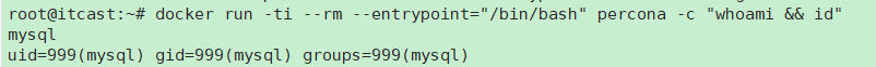 docker run -ti --rm --entrypoint="/bin/bash" percona -c "whoami && id"