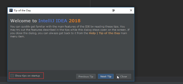 2.运行idea,进入idea主界面,页面会自动弹出这样的tips提示对话框,将默认的该选择框改为不选中,后面每次打开idea就不会弹出这样的对话框,可减少资源占用。
