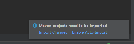 3.当pom文件有修改或者有新的依赖加入,右下角会出现如图提示,有两个选项Import changes是手动导入,Enable Auto_Import是开启自动导入。两个的区别是自动导入会在修改依赖后自动导入依赖,占用计算机更多资源,一般计算机都建议点手动导入。