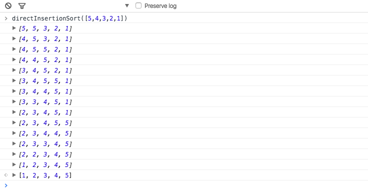 为了更好的观察到直接插入排序的实现过程, 我们不妨将上述代码中的注释部分加入. 以数组 [5,4,3,2,1] 为例, 如下便是原数组的演化过程.