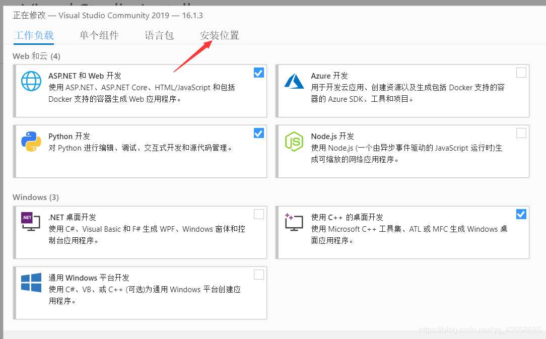 如果不需要修改安装位置的话点击安装就可以了。不过由于vs2019占用的空间较大最好不要装在C盘。可以在安装位置修改安装的路径。
