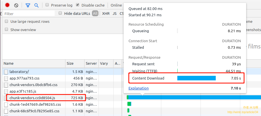 可以看到之前生成的chunk-vendors文件,大小725K,请求时间7.10秒,其中下载时间7.05秒,太慢了。配置一下nginx,打开gzip: