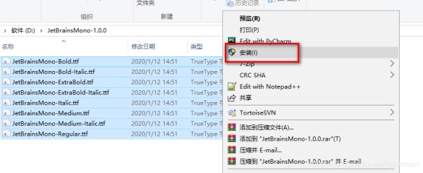 解压安装包后,选中所有字体文件,右键安装,完成后重启intellJ Idea