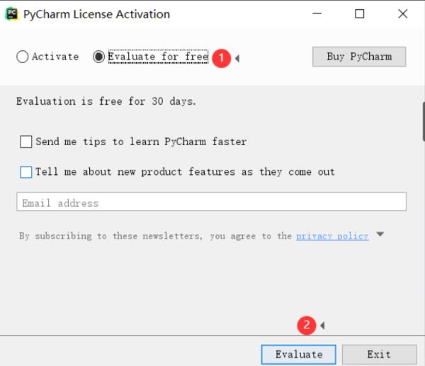 如果你之前已经使用有效期激活过可跳过此步骤,如果你是刚下载的pycharm,则需要点击激活窗口的“Evaluate for free”免费试用