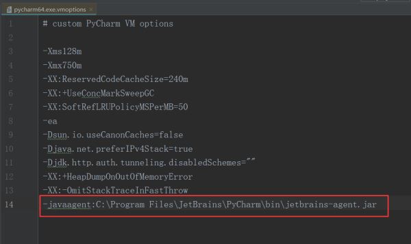 在打开的编辑窗口末行添加(补丁文件的绝对路径):-javaagent:你pycharm的安装目录\bin\补丁文件名