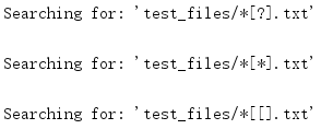 这个模式会匹配目录test_files中的所有路径名(文件或目录),但不会进一步递归搜索到子目录。glob()返回的数据不会排序,所以这里的实例会进行排序以便研究结果。