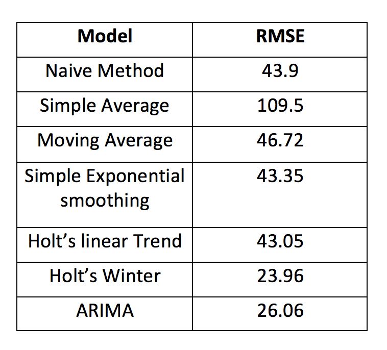 from sklearn.metrics import mean_squared_error from math import sqrt rms = sqrt(mean_squared_error(test['Count'], y_hat['naive'])) print(rms)