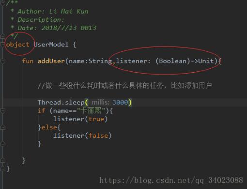 用单例实现,而kotlin写一个单例是相当的简单,object即可。一个添加用户的方法,最后一个参数传递一个lambda表达式,用于通知presenter操作结果。表达式作为最后一个参数的写法我非常喜欢,一个是不用像JAVA那样定义一个接口,然后再回调,再一个是调用的地方后面加一个大括号即可。