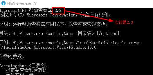 根据错误信息提供的提示,在该目录下打开命令行,输入 HlpViewer.exe /? 查看该程序的参数及选项说明,如下图:
