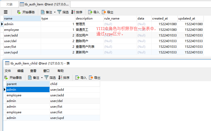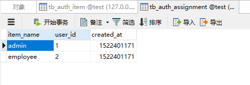 auth_assignment 角色与用户的关联表 auth_item 存放角色与权限,通过type字段区分 auth_item_child 存放角色与权限的上下级关系 auth_rule 规则表,用于扩展权限功能