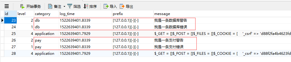 'log' => [ 'traceLevel' => YII_DEBUG ? 3 : 0, 'targets' => [ [ //日志处理器类,这里我改用数据库存日志了 'class' => 'yii\log\DbTarget', //日志记录的级别 'levels' => ['error', 'warning'], //追加上下文信息,默认YII会包含PHP全局变量,这里我们不需要,设为空。 'logVars' => [], //定义分类 'categories' => ['db'], ], [ //日志处理器类,这里我改用数据库存日志了 'class' => 'yii\log\DbTarget', //日志记录的级别 'levels' => ['error', 'warning'], //追加上下文信息,默认YII会包含PHP全局变量,这里我们不需要,设为空。 'logVars' => [], //定义分类 'categories' => ['pay'], ], ], ],