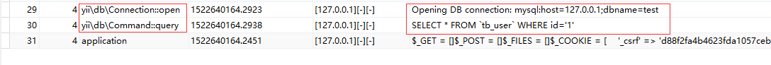'log' => [ 'traceLevel' => YII_DEBUG ? 3 : 0, 'targets' => [ [ 'class' => 'yii\log\FileTarget', 'levels' => ['error', 'warning'], ], [ //日志处理器类,这里我改用数据库存日志了 'class' => 'yii\log\DbTarget', //日志记录的级别,这里演示设为info 'levels' => ['info'], //定义分类 'categories' => ['yii\db\*'], ], ], ],