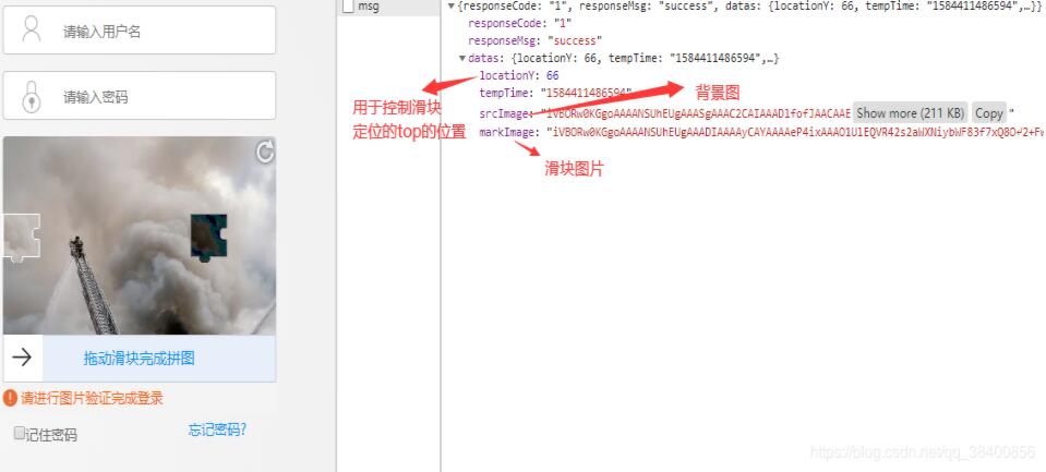 实现思路:所有的图片数据,验证全部由后端来做。前端调用接口,后端会返回两张经过base64加密的图片信息,分别是背景图片和滑块图片,前端滑动滑块以后将X方向的滑动距离传回后端做验证,验证成功以后再做后续的登录逻辑验证,以下是完整的过程: