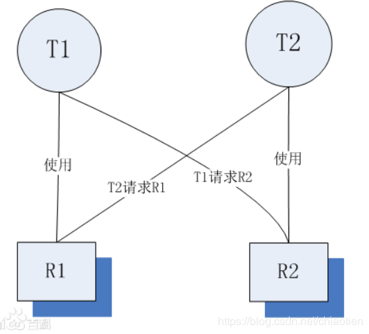 T1拥有R1,T2拥有R2。T1请求使用R2,T2请求使用R1,但是T1,T2 都不愿释放R1,R2,互相一直等待下去,造成死锁