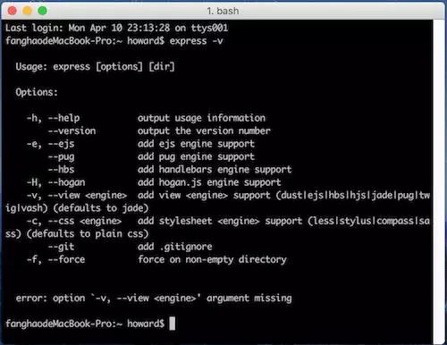 a.打开终端,输入: npm install express-generator -g MacBook用户全局安装的时候记得在前面加上sudo