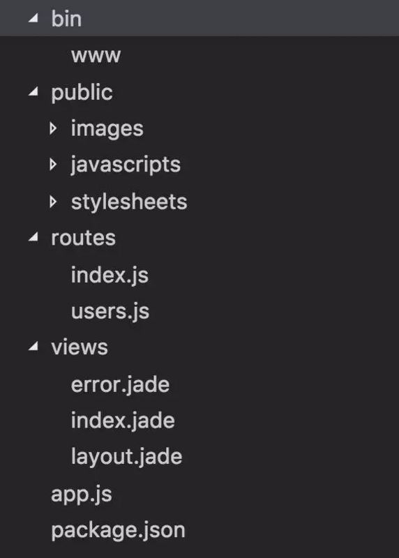 2.生成express应用目录,假设这个应用的名称为myapp 在终端输入 express myapp 在当前目录就生成了一个myapp目录,目录结构如下: