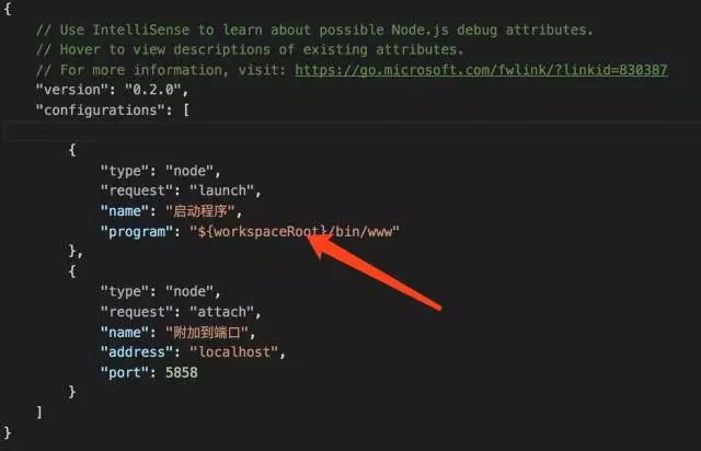 我们发现当前这个字段已经有值了,不要慌,那是因为VScode在初始化这个配置文件的时候,会查看package.json中是否有包含了键名为start的scripts,如果有的话,就会把start配置的内容作为“program”字段的值。