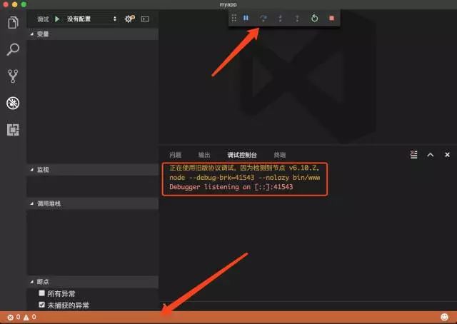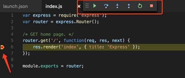 9.设置完断点之后,重新启动调试,然后在浏览器中访问localhost:3000,这时候,断点的形状发生了变化,程序停留在了断点,调试控制面板的按钮也发生了变化,从左到右依次是单步跳过,单步调试,单步跳出,重启,停止调试。这几个都是常见的断点调试指令。设置完断点之后,重新启动调试,然后在浏览器中访问localhost:3000,这时候,断点的形状发生了变化,程序停留在了断点,调试控制面板的按钮也发生了变化,从左到右依次是单步跳过,单步调试,单步跳出,重启,停止调试。这几个都是常见的断点调试指令。