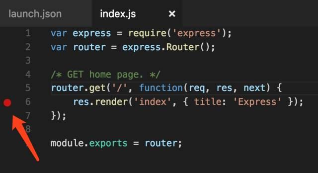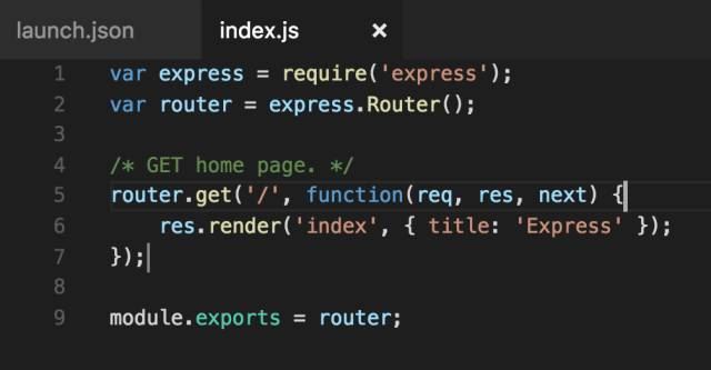 7.接下来我们开始给应用设置断点。我们打开myapp/routes/index.js文件,这个文件配置了应用根路径的路由,当前的处理是返回一个页面,传入字符串"Express"作为视图的参数。