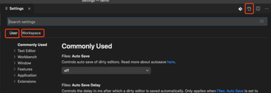 根据需要选择全局(User)或者工程(Workspace)的配置,点击右上角的编辑按钮,打开settings.json文件