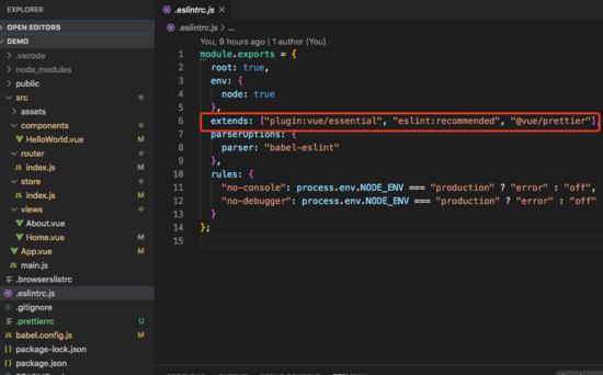 在.eslintrc.js可以看到总体的eslint规则合并了vue、eslint和prettier的一些插件库进行语法分析(eslint针对js,vue、prettier针对js、html和css,这里eslint和prettier的一些冲突已经处理)