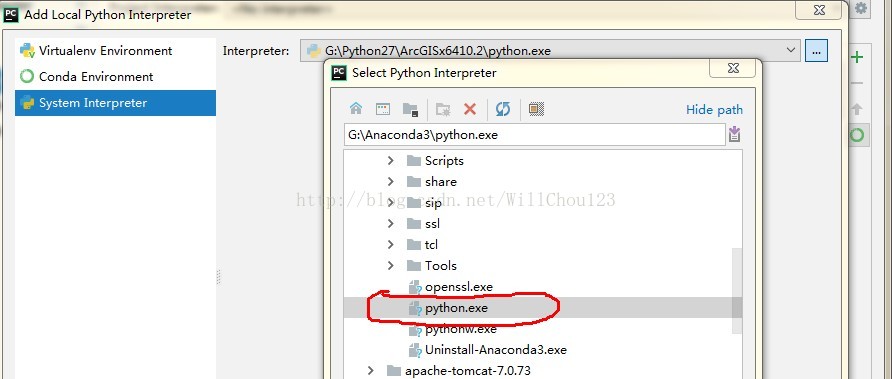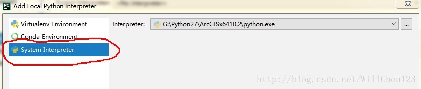 选择添加System Interpreter,使用新环境,地址为anaconda文件夹下tool文件夹中的python.exe