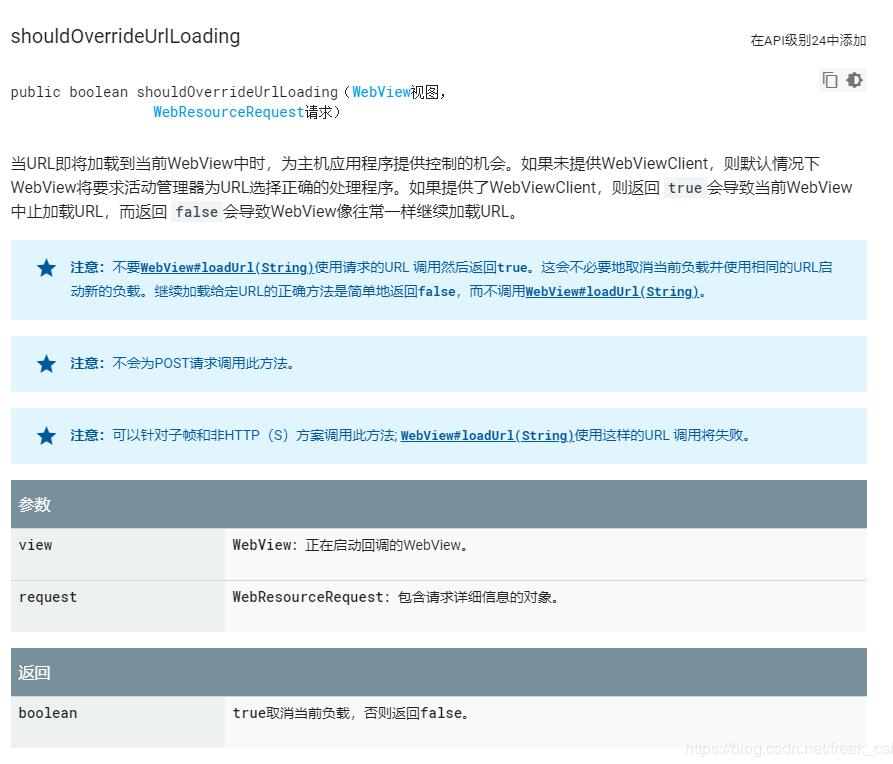 上图是Google的官方文档,我们可以知道,在h5中发起的所有的加载资源的url,都会再此方法中拦截,然后我们拦截到所以得url进行我们需要的操作。所以在所有的二级、三级等页面拼接参数就在此方法中拼接。