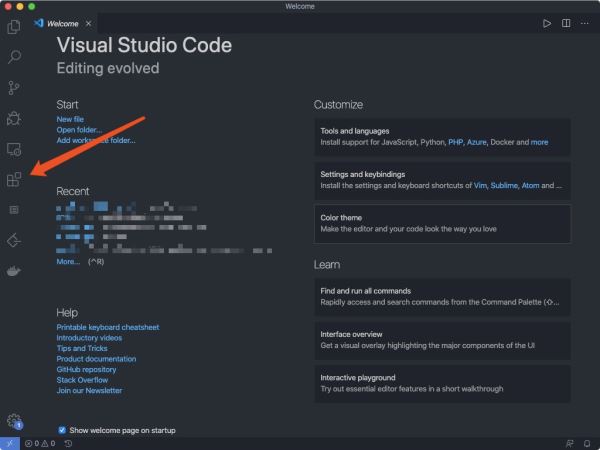 我们点击左侧边栏的extensions打开插件市场,我们可以当中进行搜索。