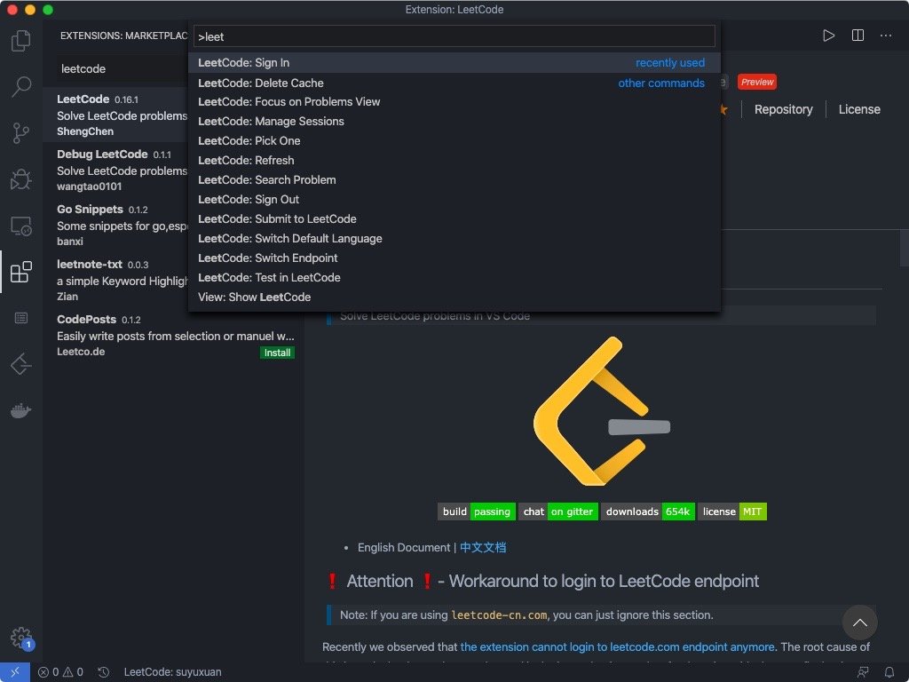我们安装之后,按住shift + ctrl(command) + p,打开插件搜索栏。输入leetcode,选择第一个sign in,然后输入账号和密码即可。