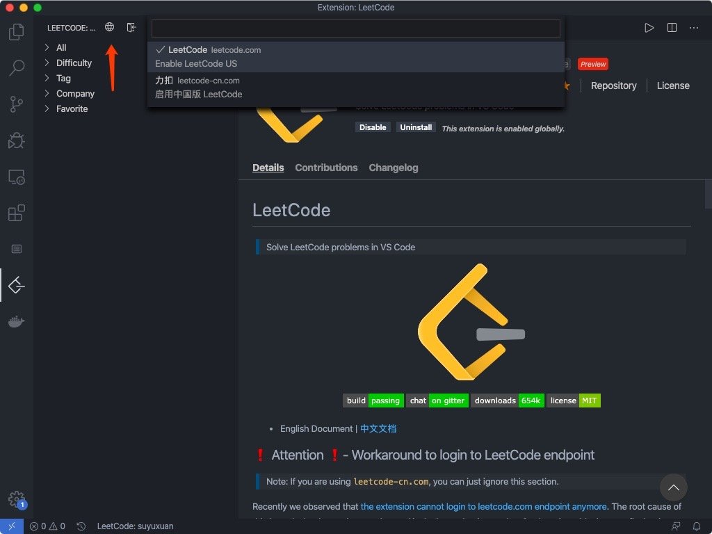 但是leetcode只升级了国际版,对于国内的版本还没有升级,所以如果你使用的是国内的leetcode账号,那么我们只需要更换leetcode版本即可。更换的方式也很简单,点击上方地球形状的按钮进行选择即可: