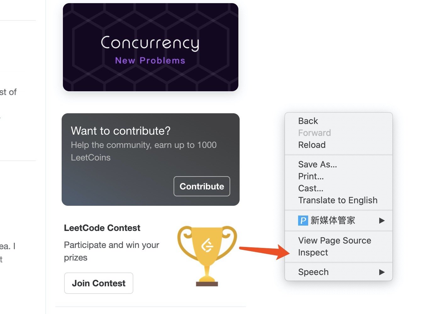 我们先打开leetcode用我们自己的账号和密码登录,然后右击选择inspect: