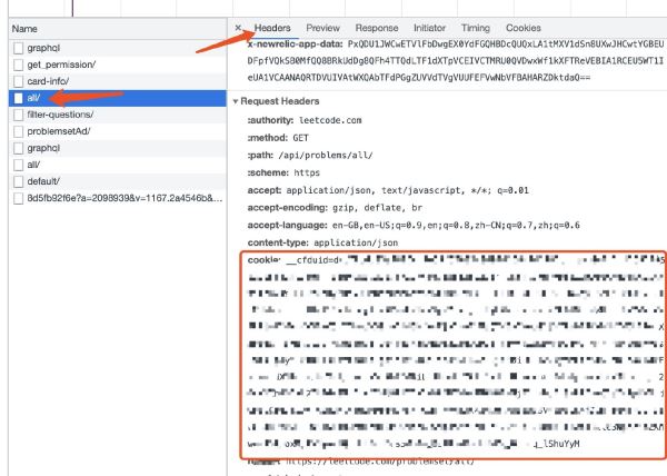 这时候右边会显示出前端网页跳转的请求信息,我们找到其中一个名叫all的请求,选择Headers,往下拉就能找到cookie: