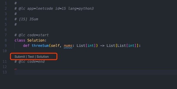 另一个配置是编辑器的快捷方式,我们仔细观察会发现我们打开的leetcode py文件下面会有两个按钮。我这张图里是三个,因为我设置过。