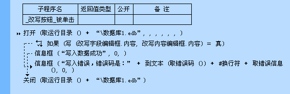 首先把要操作的数据库打开,然后执行“写()”命令,程序将改写“改写字段编辑框”中输入的字段名,改写内容为“改写内容编辑框”的内容。如果改写成功,会弹出信息框显示“写入数据成功”;如果改写失败,会弹出信息框提示失败,将本次操作的错误码和错误信息取出,并显示在信息框中,这样用户就可以知道操作数据库失败的错误原因。