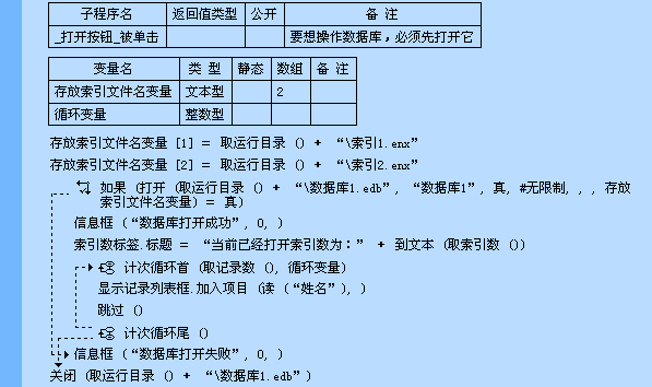 注意:在对任何易语言数据库进行操作前,都要使用“打开()”命令将数据库打开,成功打开后才能操作数据库,在操作完毕候,要将数据库关闭;指定打开数据库同时打开索引文件,如果索引文件打开失败,数据库也将打开失败。
