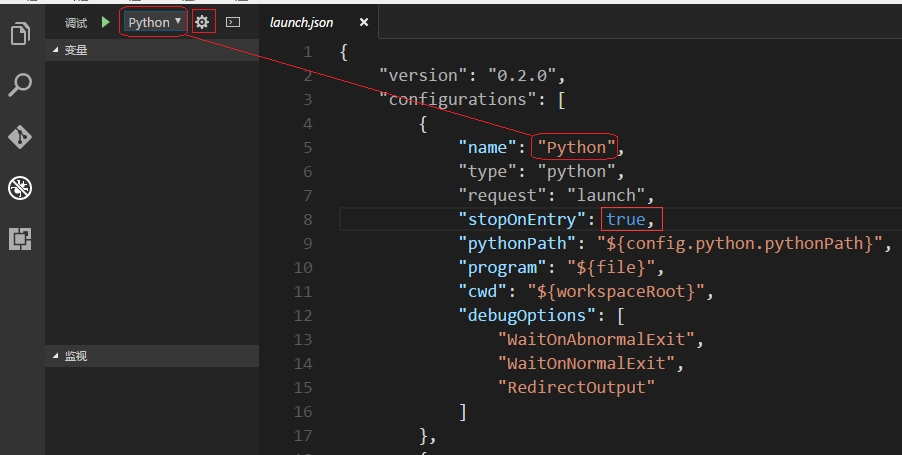 然后VSCode为我们自动生成了"launch.json"文件,此文件有很多配置项,有的选项是默认从"settings.json"中取值的(比如"config.python.pythonPath")。如果"settings.json"中没有配置它们的话,调试时可能会无法启动。