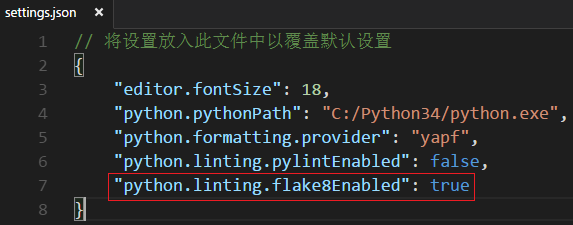 python -m pip install flake8然后配置"settings.json",启用flake8: