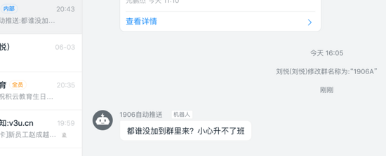 "text": {"content": '都谁没加到群里来?小心升不了班'},