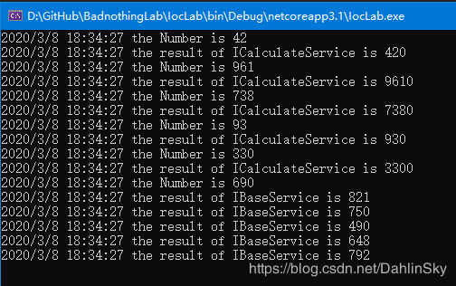之所以要for循环3次,是为了验证生命周期,和方便观察调用构造函数的次数。IBaseService接口的注入实例生命周期设置为Transient,即每次调用都会实例化一次从而产生新的随机数,而ICalculateService则采用单例模式,所以它的构造方法只被调用了一次,在控制台运行时,会在屏幕上打印结果,清晰可辨。