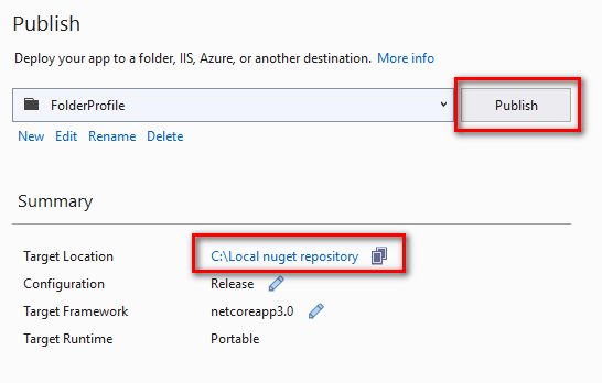 在弹出的配置窗口中选择一个发布目录,这里我们选择为本地计算机目录"C:\Local nuget repository",这个目录也会作为我们后面本地NuGet包管理器的source,实际上我们还可以选择一台远程计算机的共享目录(例如\\192.168.1.105\Remote nuget packages这种网络共享目录)作为NuGet包的source目录,这样如果我们的开发团队人员是在一个局域网中,就可以让每个开发人员的Visual Studio从局域网的共享目录中获取需要的NuGet包了。