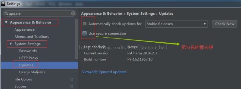 File--->Settings--->Appearance&Behavior--->System Settings--->Updates